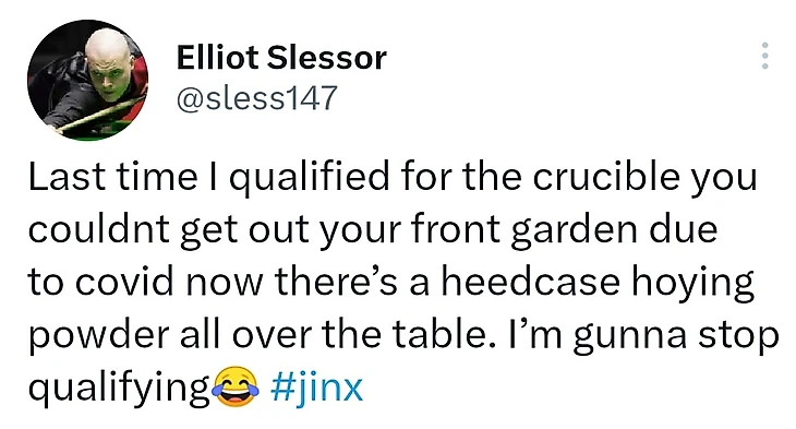 "В прошлый раз, когда я квалифицировался в Крусибл, нельзя было выйти во двор из-за ковида, теперь психи разбрасывают по всему столу цветные порошки. Мне нужно перестать квалифицироваться"