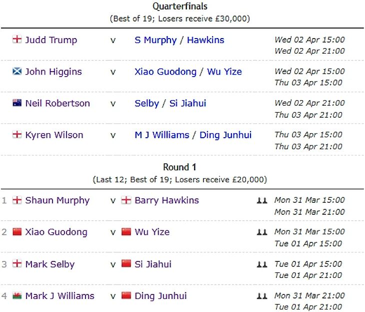 С 31 марта по 6 апреля в Манчестере пройдёт предпоследний 17-й рейтинговый турнир сезона под названием Tour Championship. Это третий и последний из серии турниров Players Series, отбор на которые идёт по годичному рейтингу.