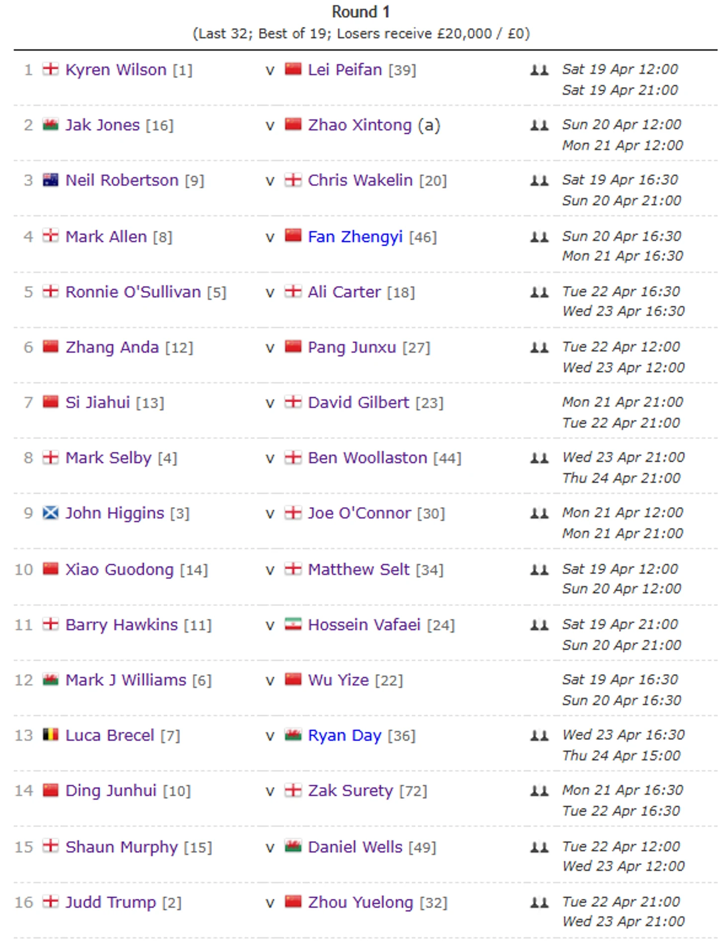 Действующий чемпион мира Кайрен Уилсон начнёт защиту титула матчем с победителем турнира Scottish Open этого сезона Пейфанем. Лидер мирового рейтинга Джадд Трамп сразится с трёхкратным финалистом рейтинговых турниров Юэлуном. А Ронни О’Салливан, если доедет до «Крусибла», будет играть с победителем чемпионата лиги этого сезона Али Картером.