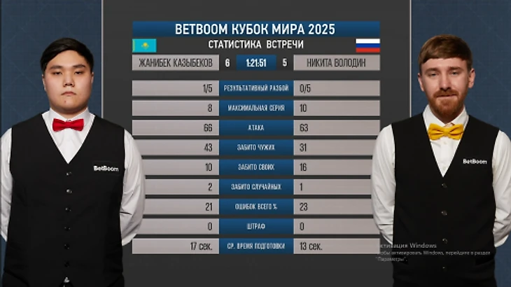 2:0, 2:4. Жанибек вел, потом Никита перехватывал инициативу. Но чувство надвигающейся жары Никиту Володина не подвело: спортсмены не могли выявить сильнейшего, сыграли 5:5. Как Жанибек вернулся с 2:4… Повел 5:4 за 3 минуты до конца встречи. И какой уровень уже Никита на фоне стресса продемонстрировал в десятой партии!