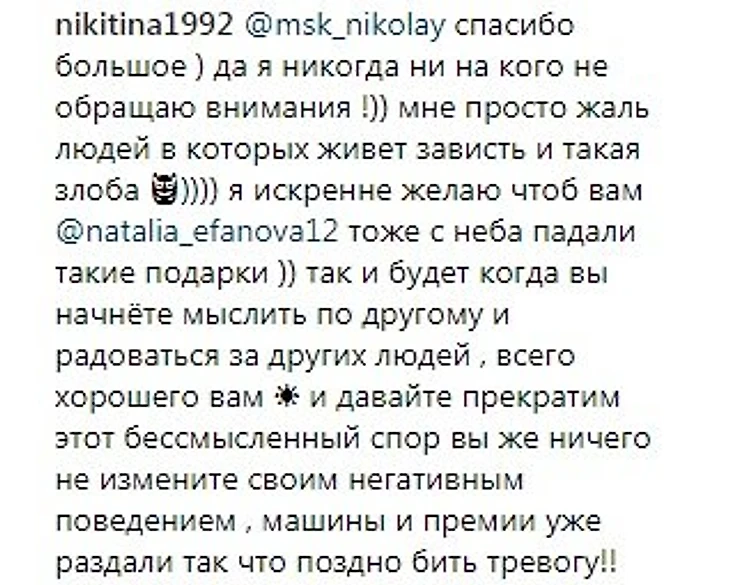 И давайте прекратим этот бессмысленный спор, вы же ничего не измените своим негативным поведением, машины и премии уже раздали, так что поздно бить тревогу!» – написала Никитина.