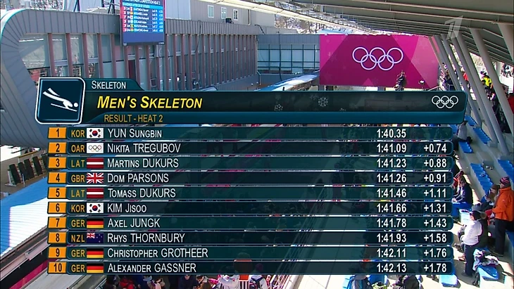 Открыли Олимпийские игры, как и все соревнования под эгидой IBSF, спортсмены из конца второй десятки сильнейших. Здесь и ямаец, и ганец, которые, забегая вперёд, по итогам уже двух первых попыток будут проигрывать совершенно безумные для скелетона 6 и 8 секунд. Но потом как бальзам на душу болельщика вышла на трассу «тяжёлая артиллерия» в лице хозяина трассы Юн Сунгбина. Победитель общего зачёта Кубка мира этого сезона в первой же попытке устанавливает рекорд трассы. И мы начинаем понимать, что вероятность, что его кто-нибудь подвинет с первого места, ничтожно мала. Так и вышло. Ближе всего по итогам первой попытки к корейцу приблизился Никита Трегубов — 0,31 секунды в отставании. Третий результат показал Аксель Юнгк — +0,49 от Сунгбина.
