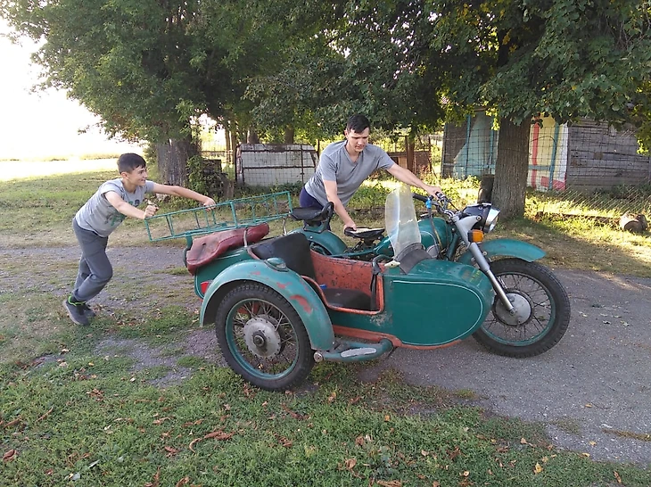 (фото: победители конкурса в социальных сетях семья Пияк, их новенький мотоцикл ЗиД 150 и старенький "Днепр")