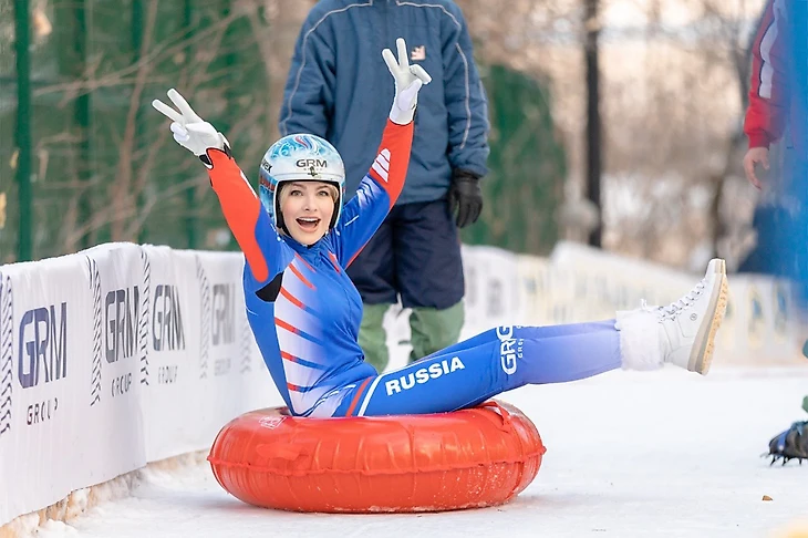 Президент Федерации санного спорта России Наталия Гарт, покорила трассу в настоящей гоночной спортивной экипировке.