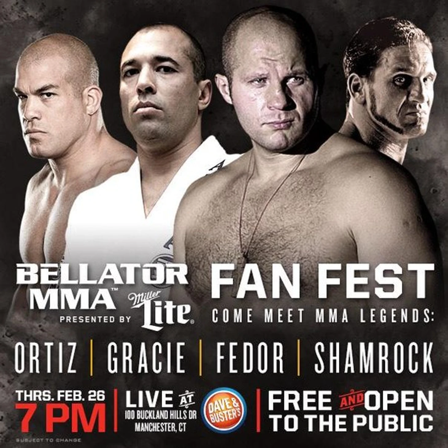 26 февраля на специальном мероприятии Федор Емельяненко совместно с Тито Ортизом, Хойсом Грейси и Кеном Шемроком пообщается со своими фанатами и поучавствует в автограф-сессии, а на следующий день постетит турнир Bellator 134, главным событием которого станет титульный бой в полутяжелом весе между Эмануэлем Ньютоном и Лиамом МакГири