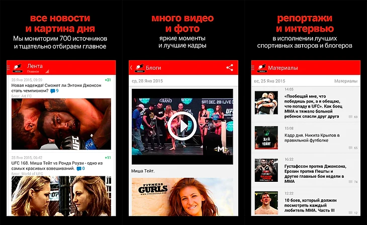 – Новости, анонсы и статьи о мире бокса и смешанных единоборств; – Видео, Gif и фото боев; – Тексты лучших спортивных журналистов и интервью со спортсменами и специалистами; – Блоги и материалы пользователей Sports.ru; – Форумы и чаты для общения с другими болельщиками