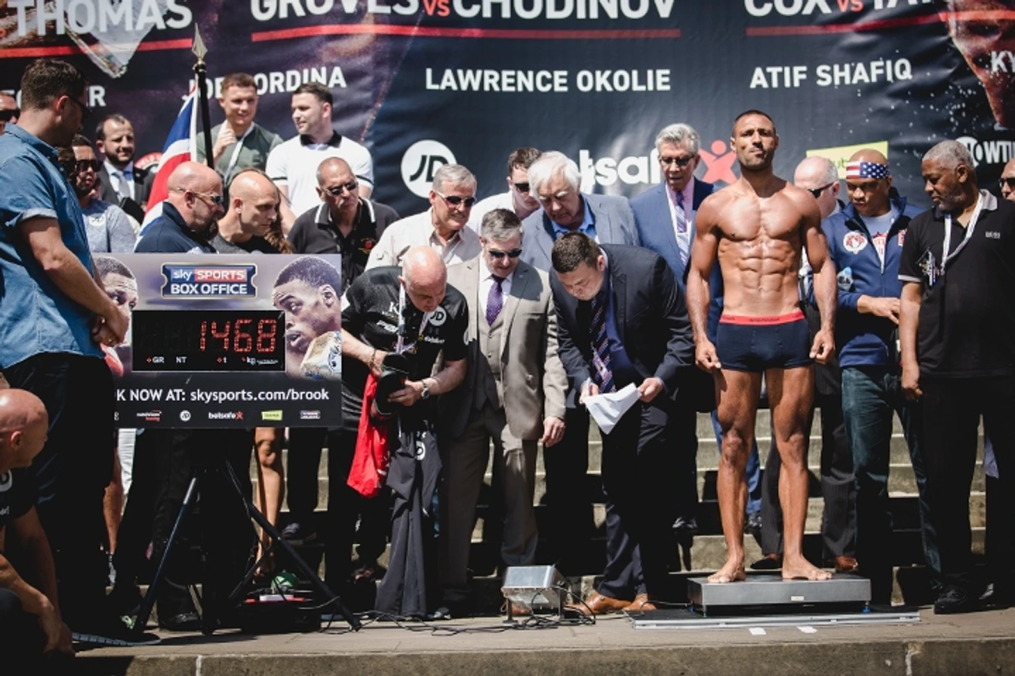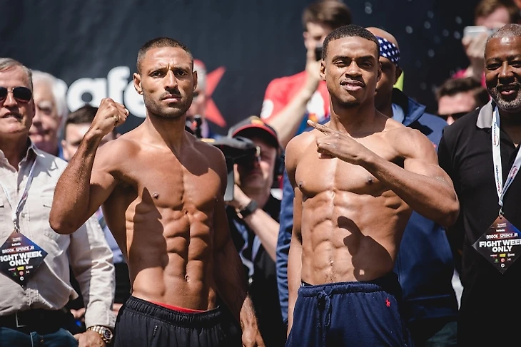 Состоялось официальное взвешивание перед вечером боев в Шеффилде (Великобритания). В главном бою вечера чемпион IBF в полусреднем весе, британец Келл Брук (36-1) будет защищать свой титул против американца Эррола Спенса (21-0). Стоит отметить, что свое единственное поражение в профессиональной карьере Брук потерпел от Геннадия Головкина в среднем весе.