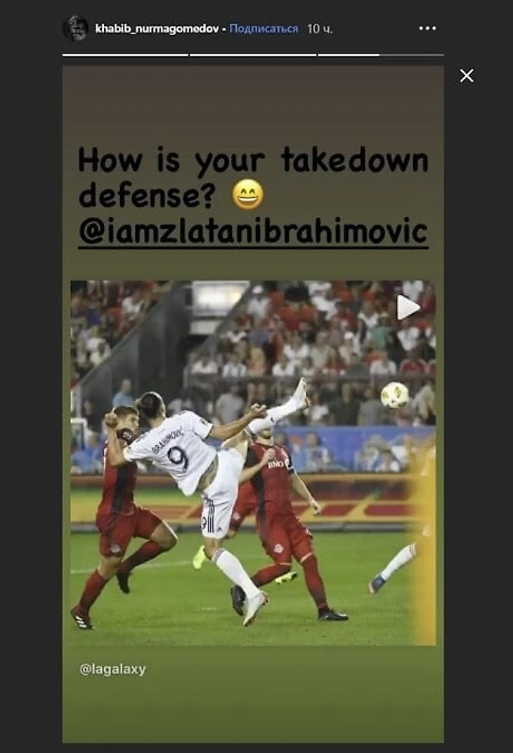 «А как у тебя с защитой от тейкдаунов?» – написал россиянин в инстаграм, опубликовав в сторис ссылку на видео, где Ибрагимович ударом с разворота забивает гол.