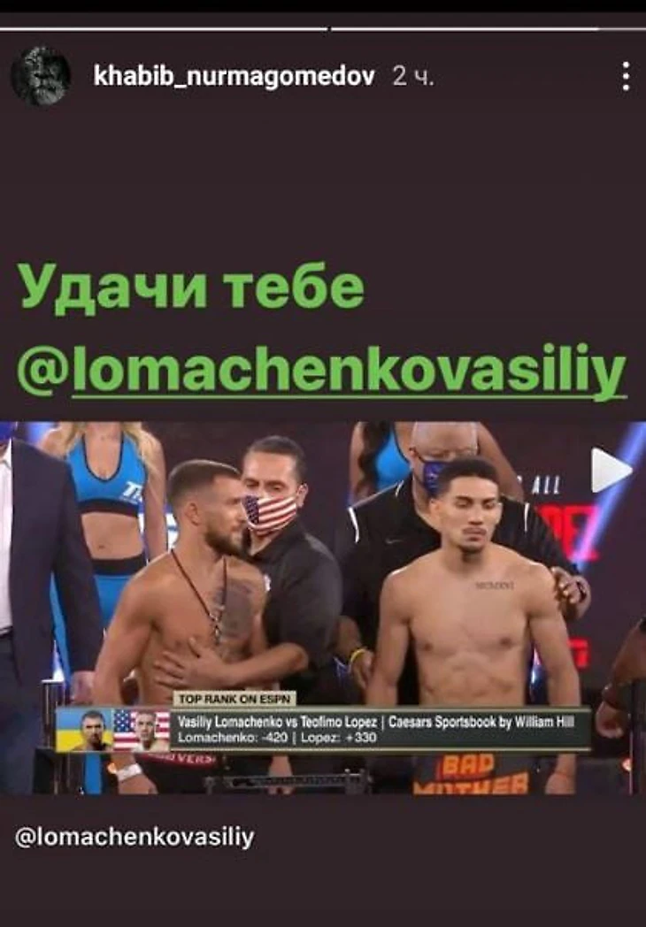 Чемпион UFC в легком весе Хабиб Нурмагомедов поддержал удачи чемпиону мира во версиям WBA, WBO в легком весе Василию Ломаченко (14-1, 10 КО) накануне поединка с обладателем титула IBF Теофимо Лопесом (15-0, 12 КО).