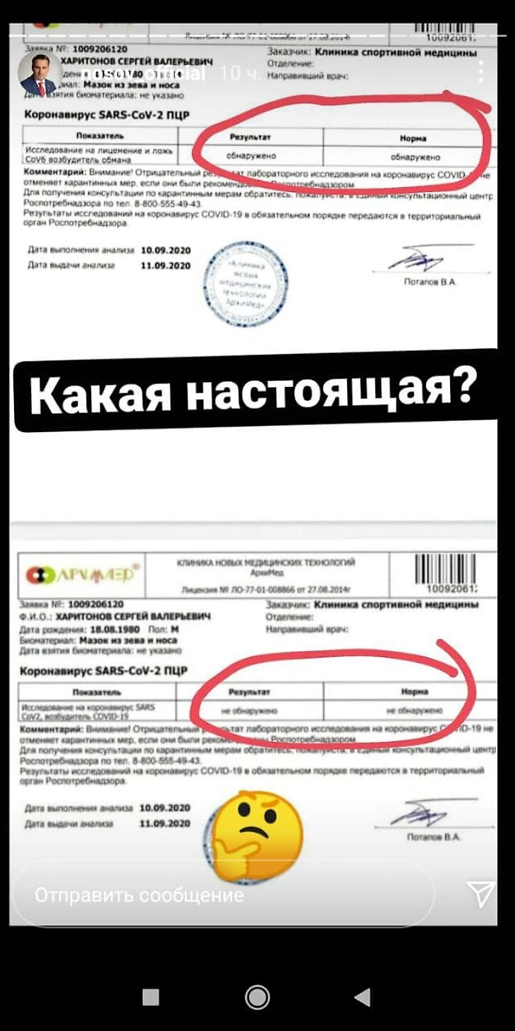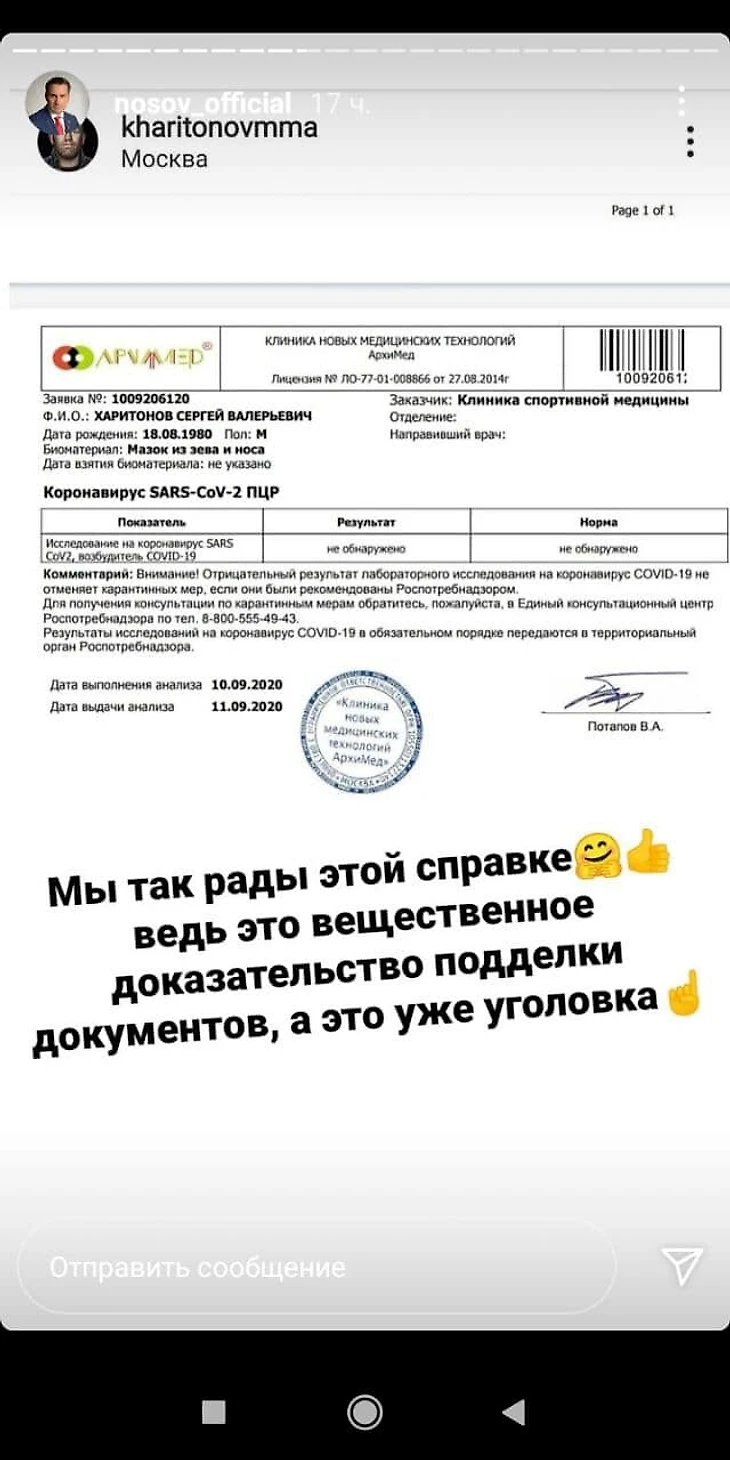 Харитонов показал справку об отрицательном тесте на COVID-19 в сентябре. Носов пригрозил уголовной ответственностью