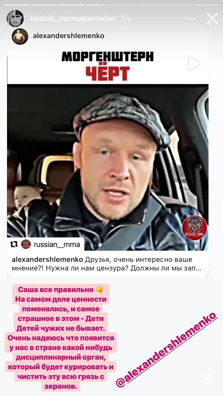Бывший чемпион UFC Хабиб Нурмагомедов поддержал Александра Шлеменко, который назвал рэпера Моргенштерна «бесом».