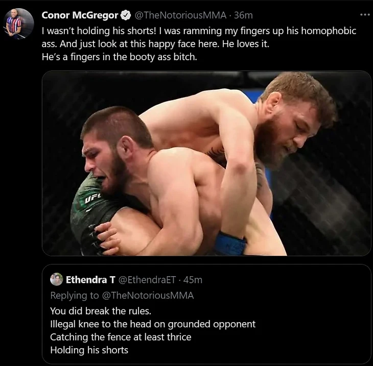 «Я долбил пальцами его гомофобную жопу. И вы только посмотрите на это счастливое лицо». Конор написал про Хабиба и удалил твит