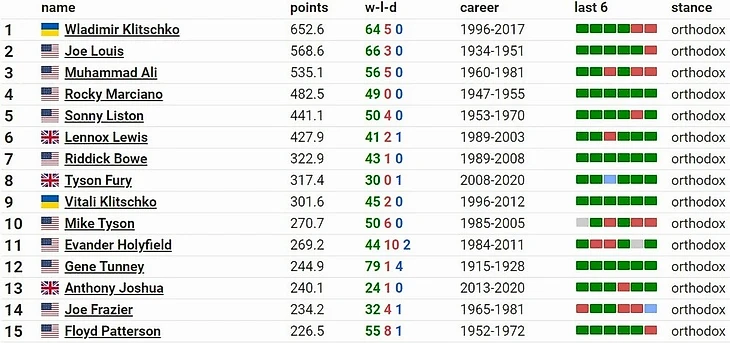 Украинский тяжеловес Владимир Кличко занял первое место, обогнав почти на 100 баллов Джо Луиса.