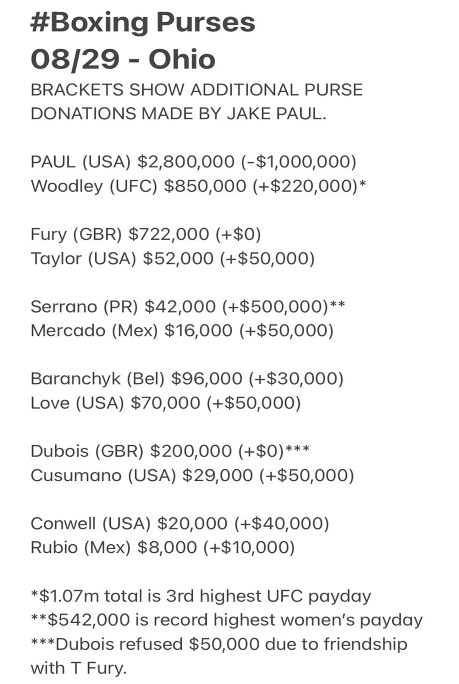 1 млн долларов Пол раздал боксерам, выступавшим с ним в одном карде. Вудли к 850 тысячам долларов получил 220 тысяч.