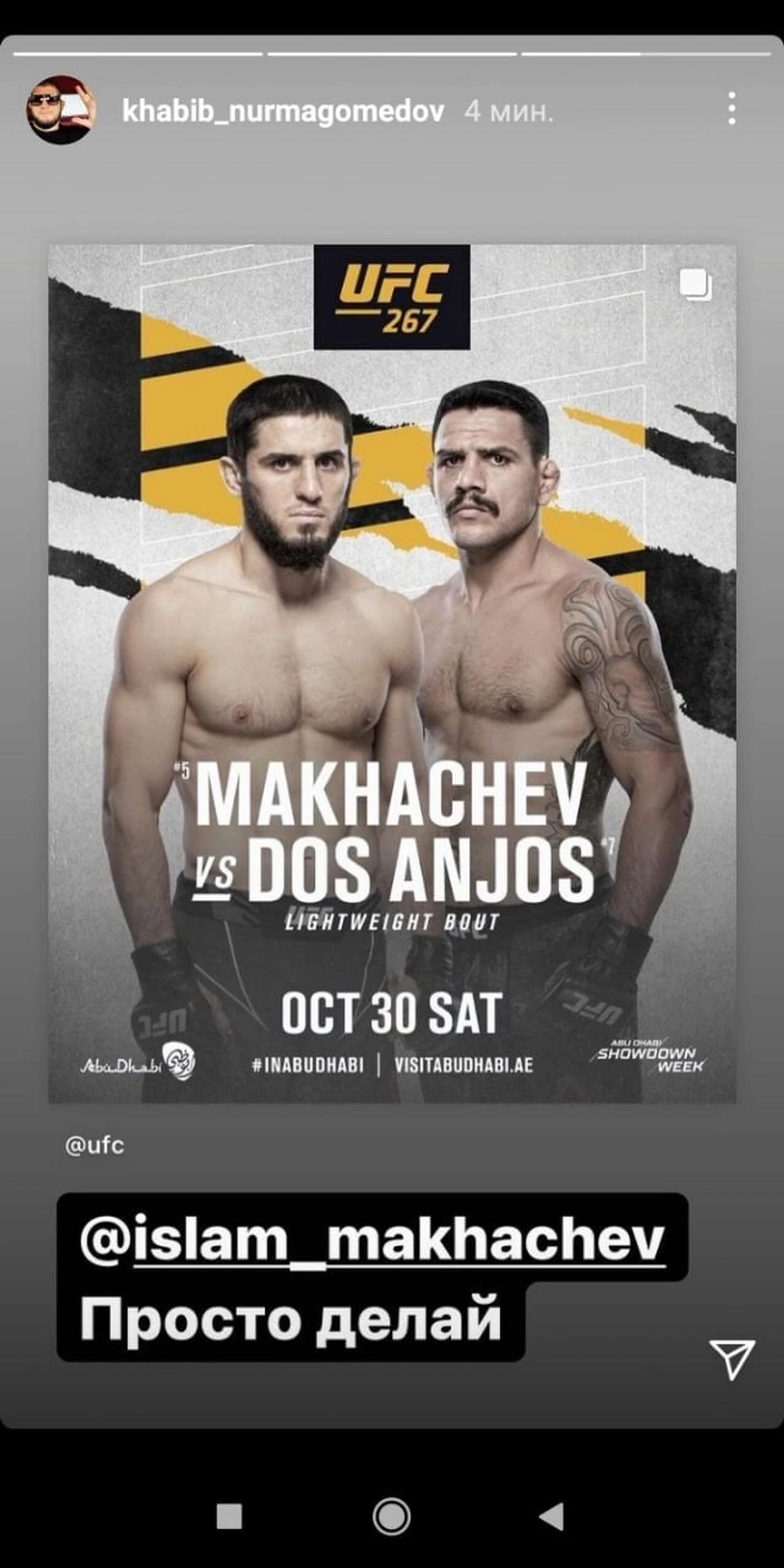 Экс-чемпион UFC в легком весе Хабиб Нурмагомедов поддержал Ислама Махачева, который 30 октября на UFC 267 в Абу-Даби проведет бой с Рафаэлем Дос Аньосом.