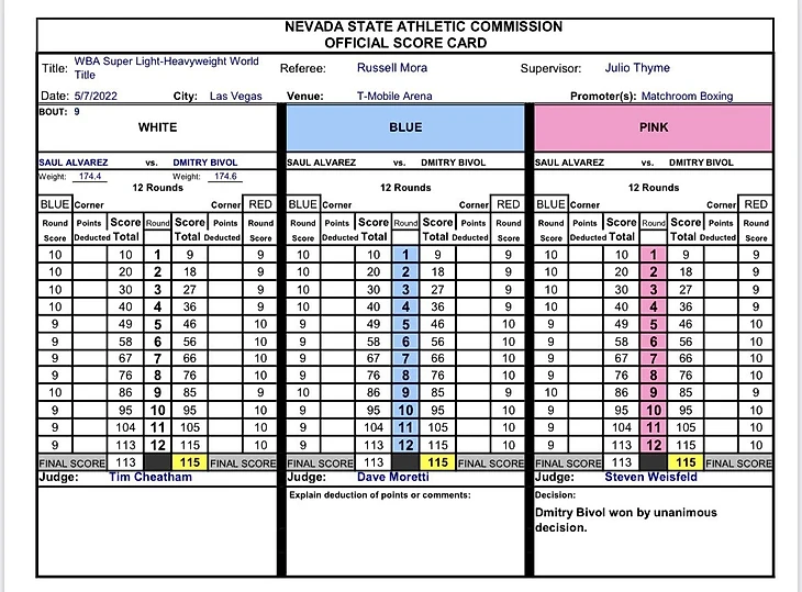 Опубликованы судейские карточки боя Дмитрия Бивола и Сауля Альвареса