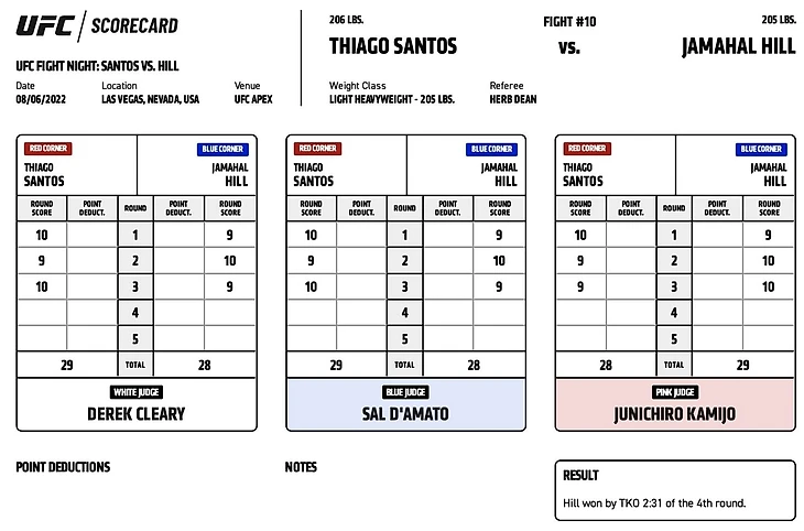 Однако перед четвертой пятиминуткой Тиаго лидировал на судейских карточках. Двое рефери насчитали 29:28 по итогам трех раундов, еще один с таким же счетом отдал предпочтение Хиллу.