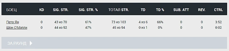 Статистика боя Ян – О’Мэлли: Петр перебил соперника, сделал 4 успешных тейкдауна и контролировал почти 4 минуты