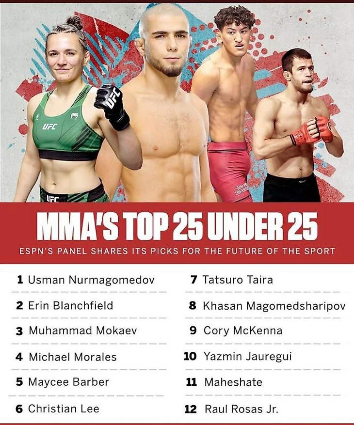 На втором месте в рейтинге ESPN 23-летняя американка Эрин Бланчфилд. Третье строчку занимает британо-дагестанский боец UFC Мухаммад Мокаев.