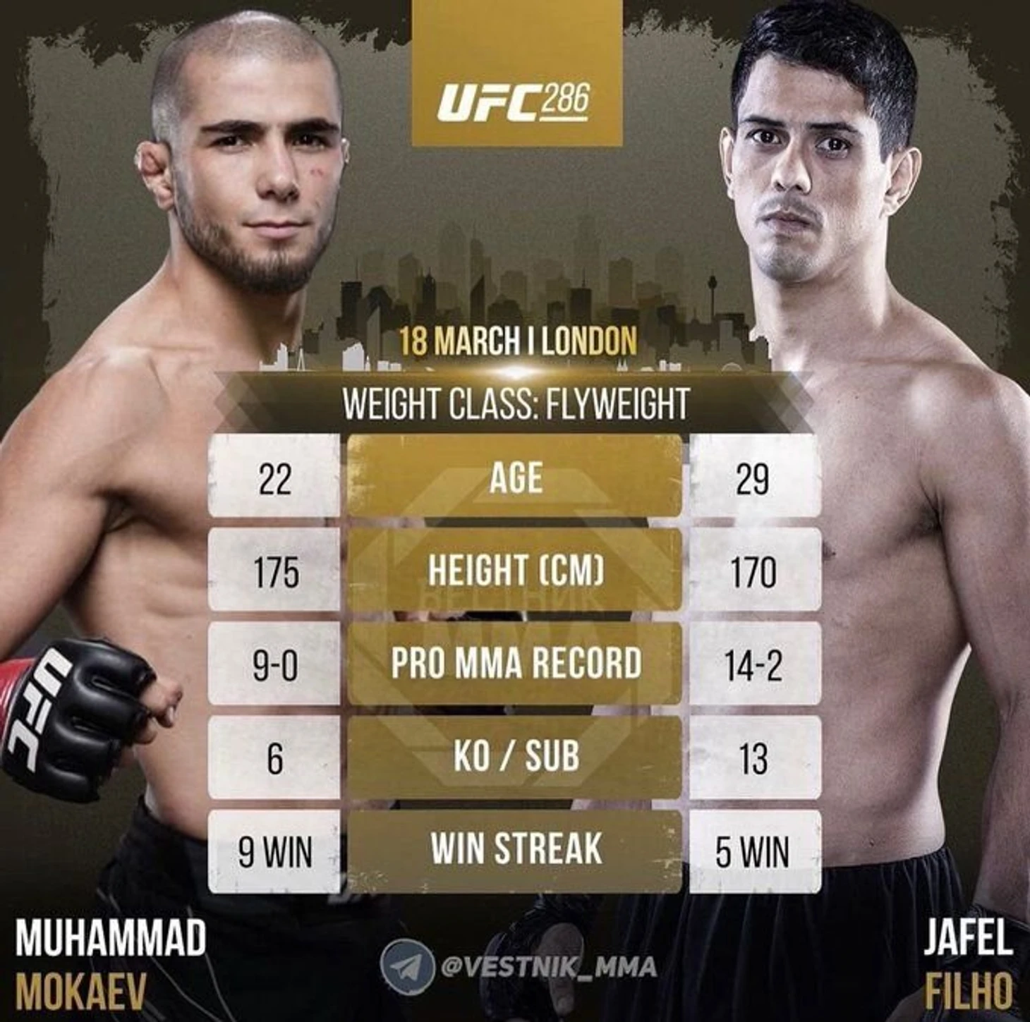 18 марта на UFC 286 в Лондоне Мокаев подерется с бразильцем Джафелем Фильхо.