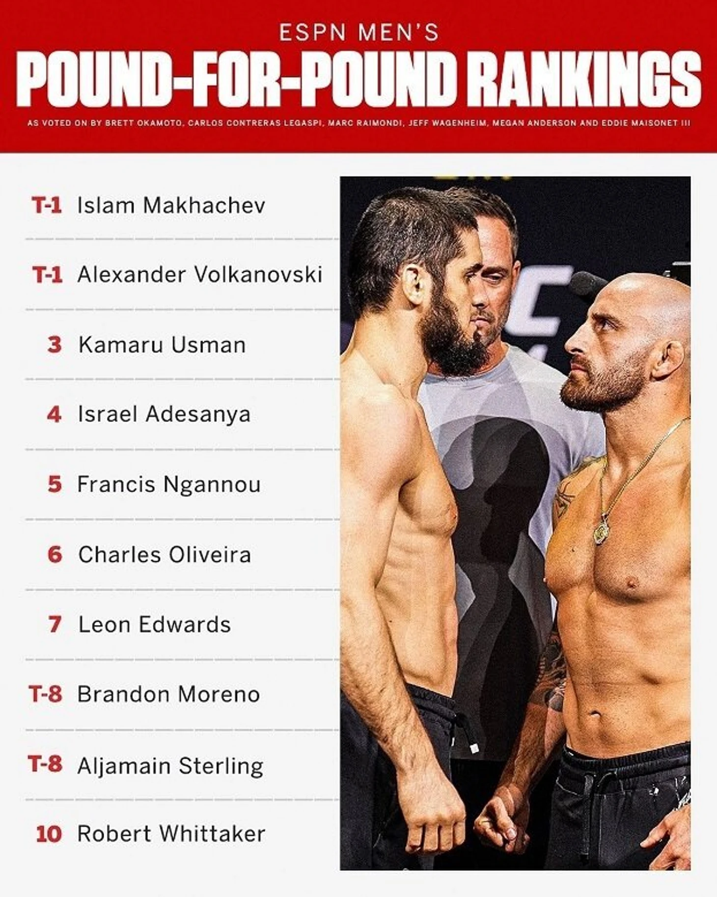 Издание ESPN поставило Ислама Махачева и Алекса Волкановски на первое место рейтинга лучших бойцов UFC вне зависимости от весовых категорий.