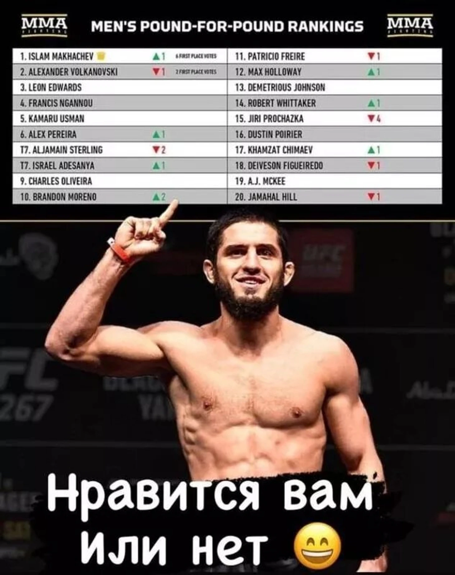 Чемпион UFC в легком весе Ислам Махачев отреагировал на первое место в рейтинге вне весовых категорий по версии MMA Fighting.
