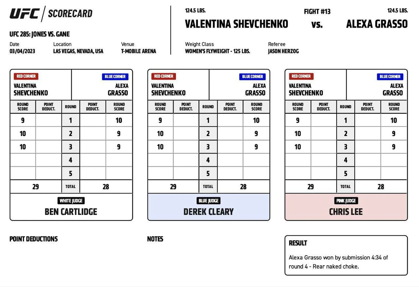 Валентина Шевченко уступила титул Алексе Грассо в четвертом раунде. На судейских записках боец из Киргизии выигрывала два раунда из трех.