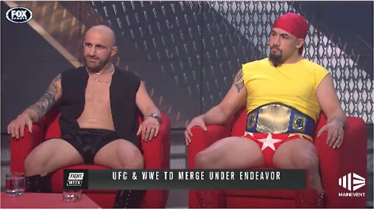 Бойцы UFC Александр Волкановски и Роберт Уиттакер пришли на FOX Sports Australia в образах звезд WWE Стива Остина и Халка Хогана.