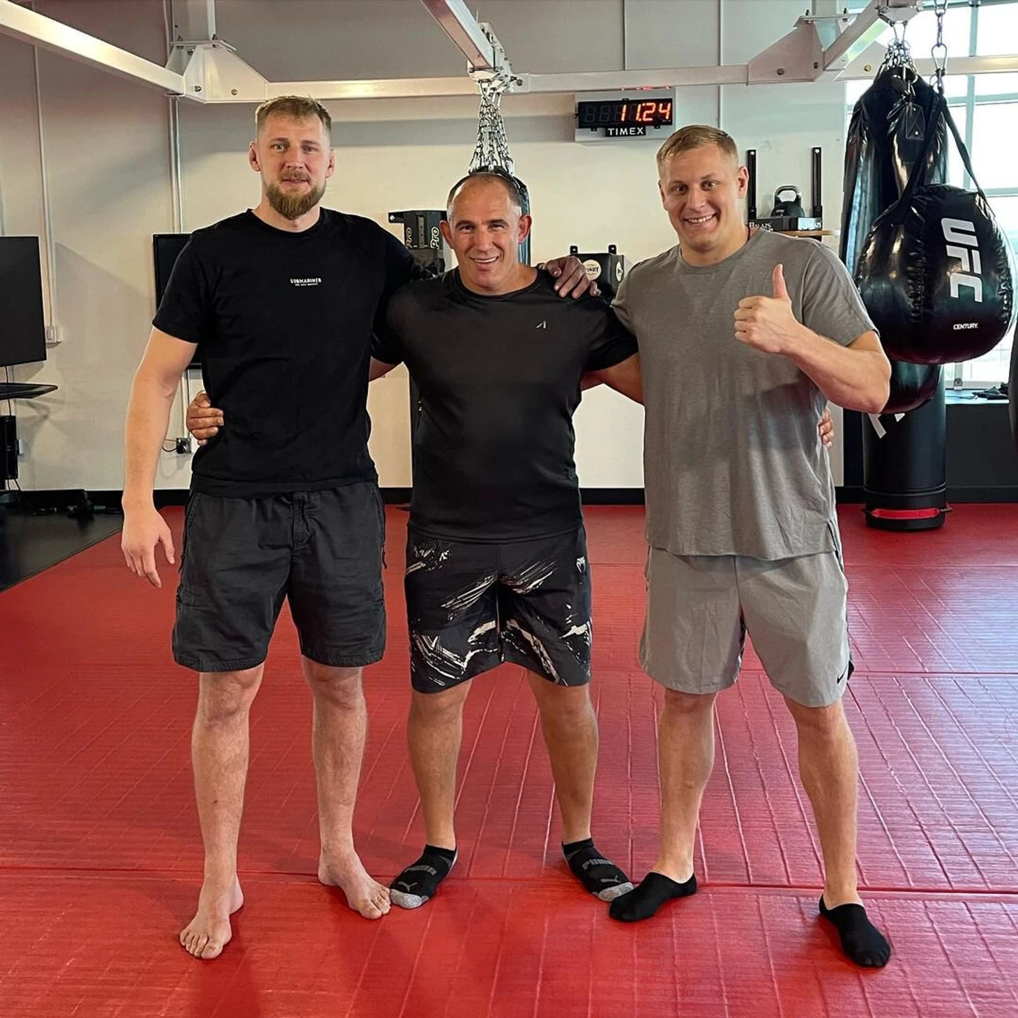 Экс-боец UFC в тяжелом весе Алексей Олейник в соцсетях выложил совместную фотографию с Александром Волковым и Сергеем Павловичем.