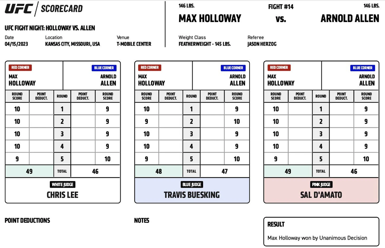 Рефери Крис Ли и Сол Д’Амато отдали Холлоуэю первые четыре раунда боя. Пятый раунд все судьи отдали Аллену.
