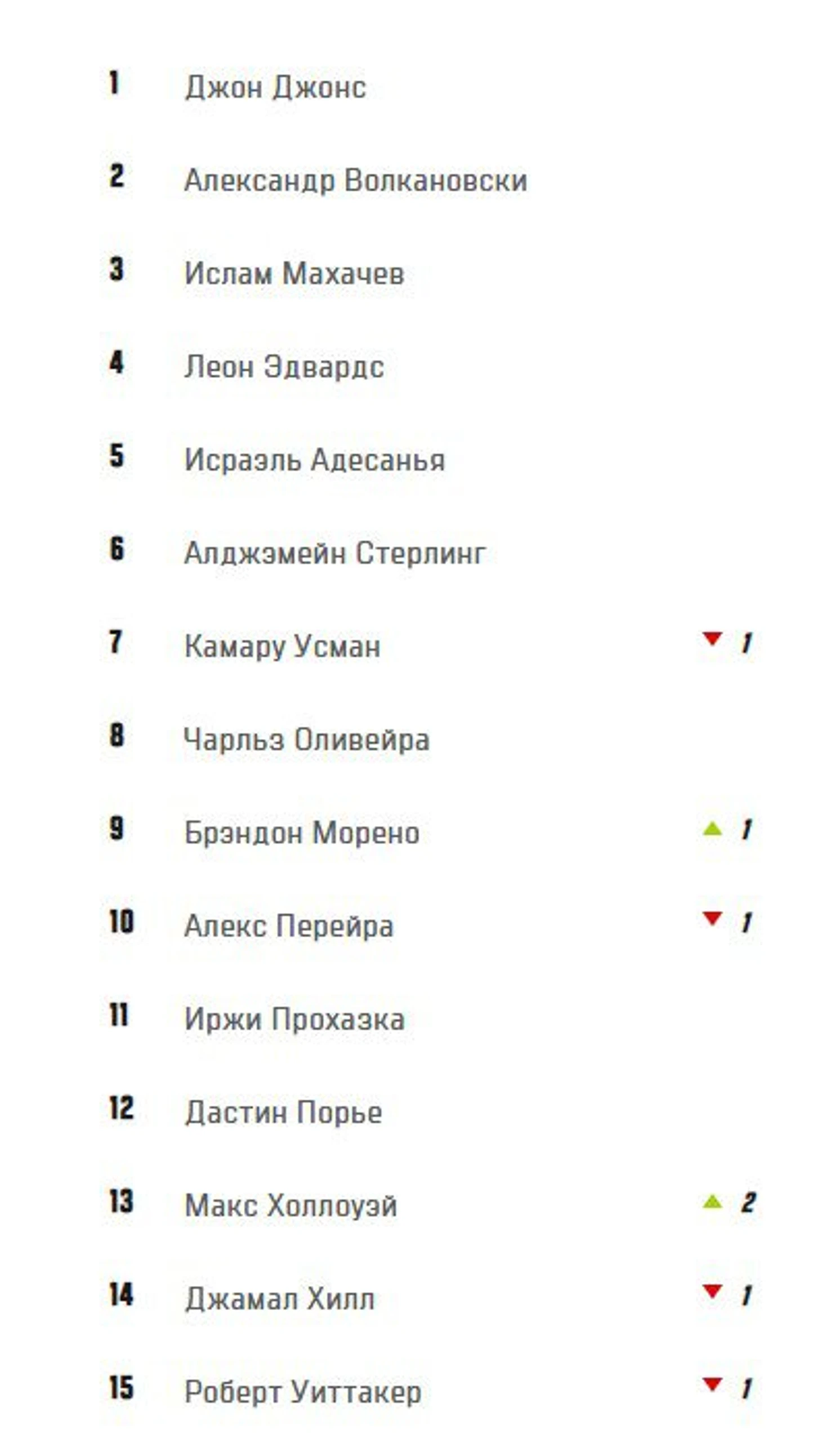 Чемпион среднего веса Исраэль Адесанья остался на пятом месте. Камару Усман занимает седьмую строчку рейтинга, а Брэндон Морено поднялся на девятое место.
