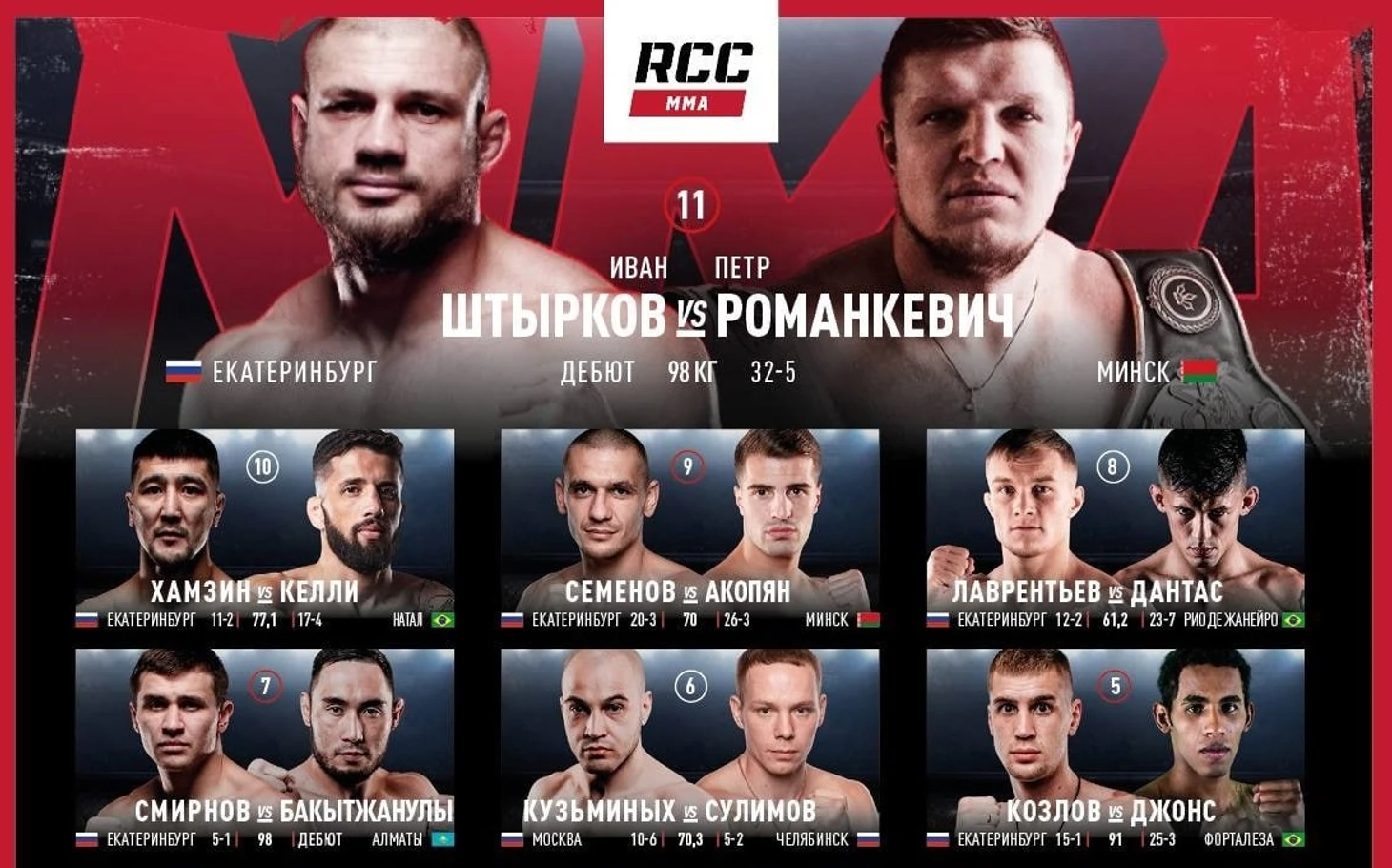 В субботу 13 мая 2023 года пройдет турнир по смешанным единоборствам и кикбоксингу RCC 15, который будет проведен в спортивном комплексе «Уралец», Екатеринбург. Главным событием вечера станет поединок в тяжелом весе между Иваном Штырковым и Петром Романкевичем.