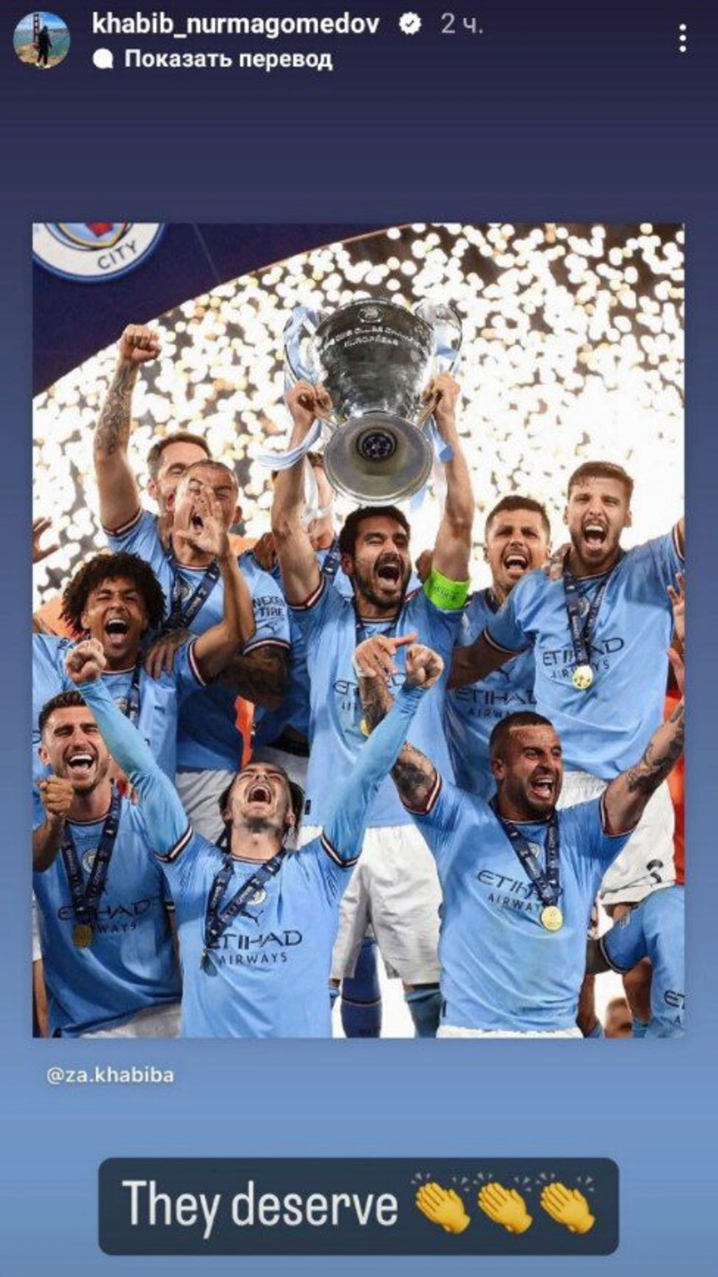 Хабиб Нурмагомедов поздравил «Манчестер Сити» с победой в Лиге чемпионов.