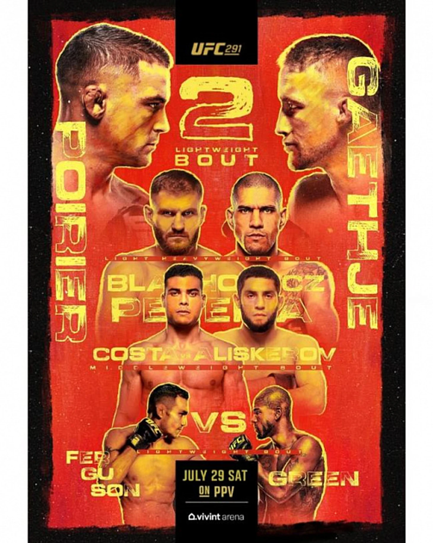 В воскресенье 30 июля 2023 года пройдет турнир по смешанным единоборствам UFC 291. В главном событии состоится схватка в легком весе между Дастином Порье и Джастином Гейджи. Бойцы сразятся за титул чемпиона UFC BMF. Бойцовский вечер будет проведен на арене «Vivint Arena» в Солт-Лейк-Сити, США.