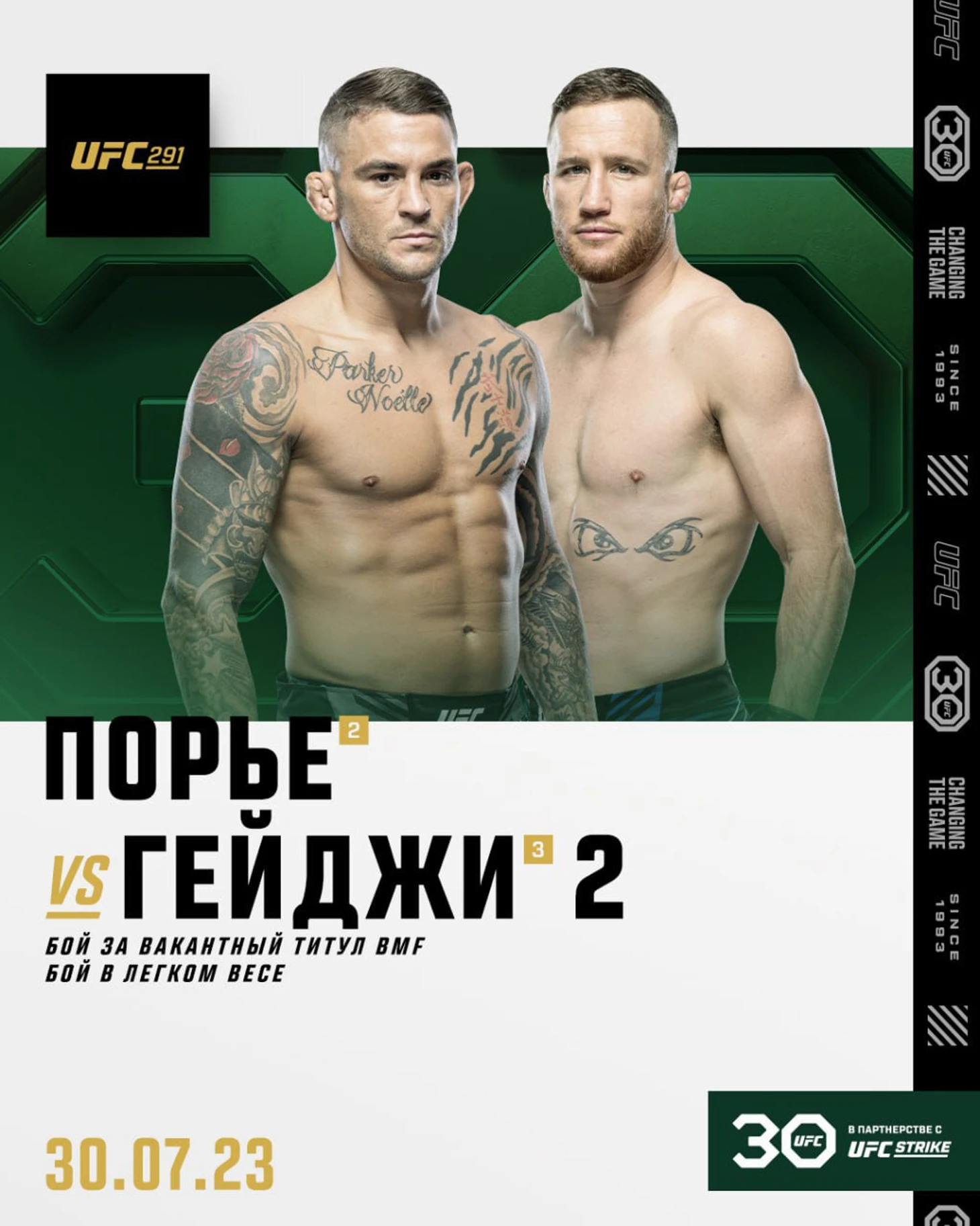 Ночью 30 июля 2023 года состоится турнир по смешанным единоборствам UFC 291. В главном поединке сразятся легковесы Дастин Порье и Джастин Гейджи. Бойцы подерутся за титул чемпиона UFC BMF. Событие будет проведено на арене «Vivint Arena» в Солт-Лейк-Сити, США.