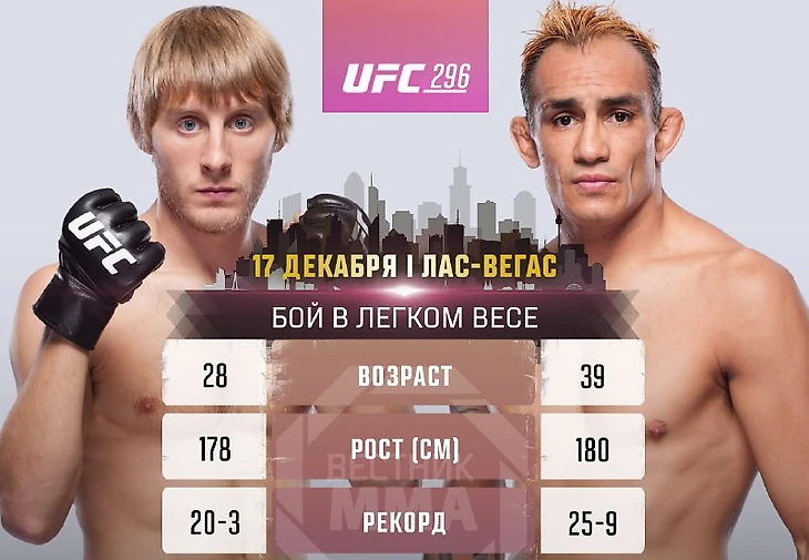 Очередной турнир UFC 296 состоится 16 декабря в Лас-Вегасе, штат Невада, на T-Mobile Arena. Главным боем вечера станет поединок за чемпионский титул в полусредней весовой категории между Леоном Эдвардсом из Великобритании и американцем Колби Ковингтоном. В основном карде еще несколько боев. Практически всегда интерес вызывает появление в октагоне Тони Фергюсона, его оппонентом выступит британец Пэдди Пимблетт. Бой состоится в легкой весовой категории. По московскому времени его начало не ранее 01:00 часов 17 декабря.