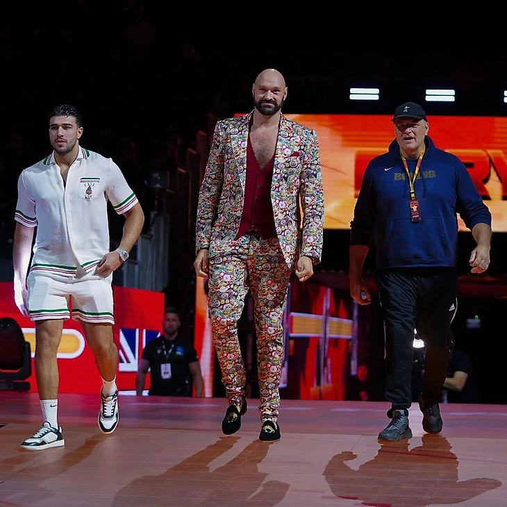 Чемпион мира по боксу в тяжелом весе по версии WBC Тайсон Фьюри прибыл на стадион в Эр-Рияде на бой между Энтони Джошуа и Фрэнсисом Нганну. На арене он появился вместе с братом и отцом.
