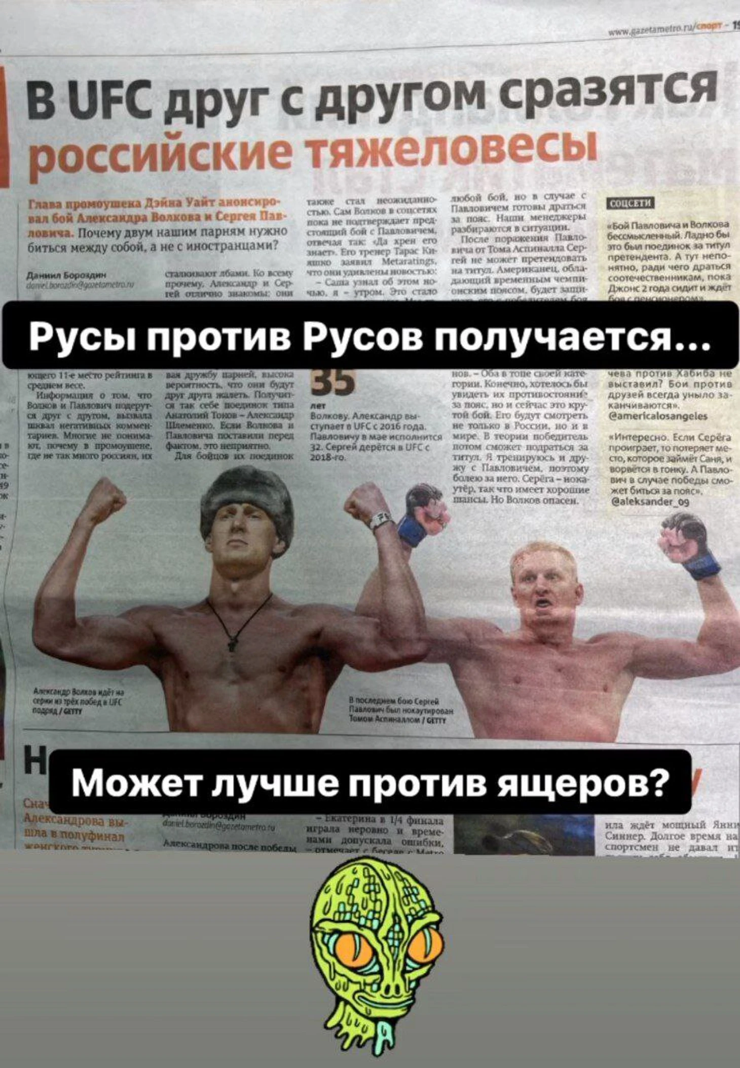 «Русы против русов, получается... Может, лучше против ящеров?» – написал в соцсетях боец UFC Александр Волков.