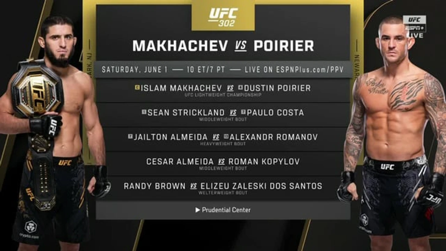 Ночью 2 июня 2024 года состоится турнир по смешанным единоборствам — UFC 302. Главным событием станет поединок в легком весе между Исламом Махачевым и Дастином Порье. Бойцам предстоит сразиться за титул чемпиона UFC. Турнир пройдет на арене «Prudential Center» в Ньюарке, штат Нью-Джерси, США.
