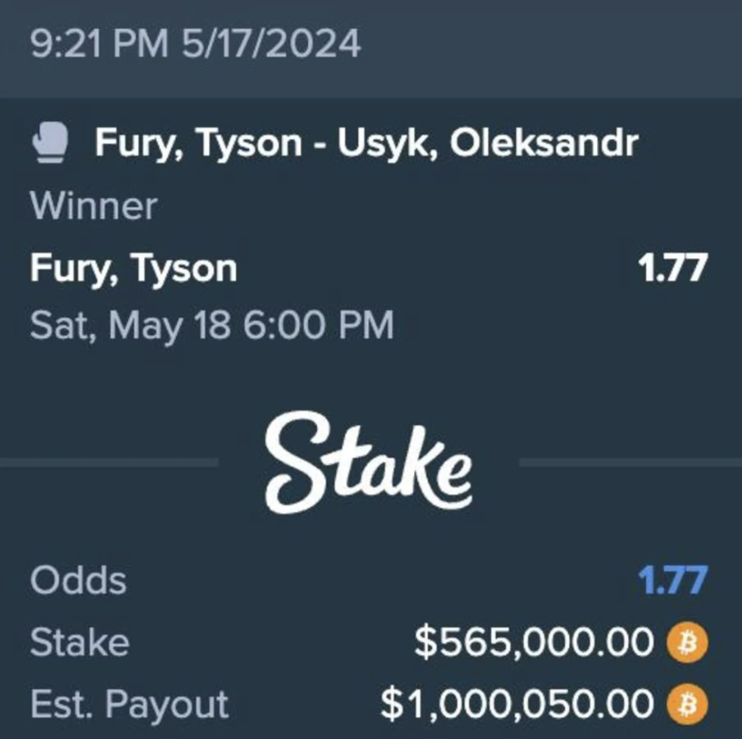Канадский музыкант опубликовал в соцсетях скриншот, подтверждающий ставку на победу Тайсона Фьюри в размере $565 тысяч.