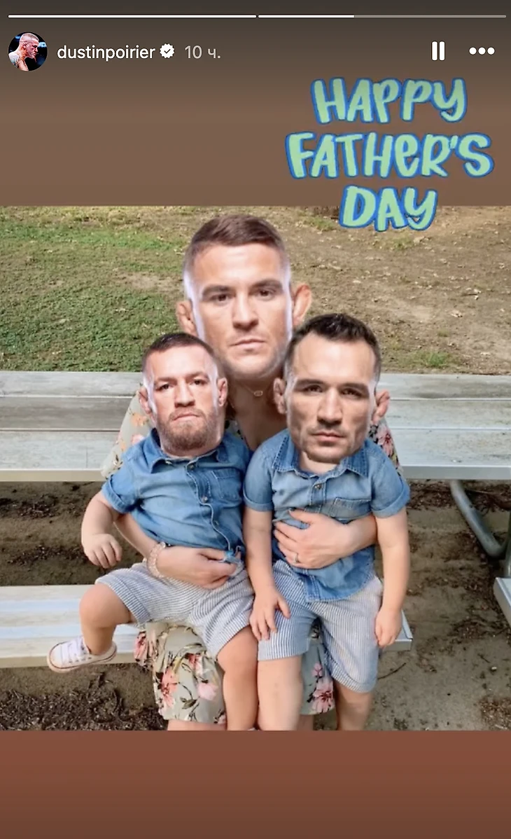 «Счастливого Дня отца», – написал в соцсетях экс-чемпион UFC Дастин Порье, выложив фото, на котором он держит на руках Конора Макгрегора и Майкла Чендлера.