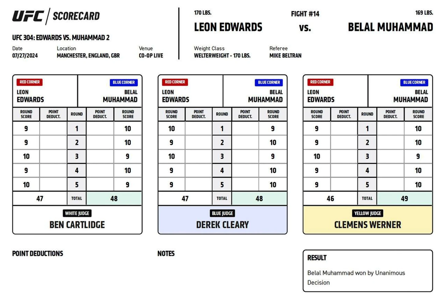Появились судейские записки поединка Леона Эдвардса и Белала Мухаммада.