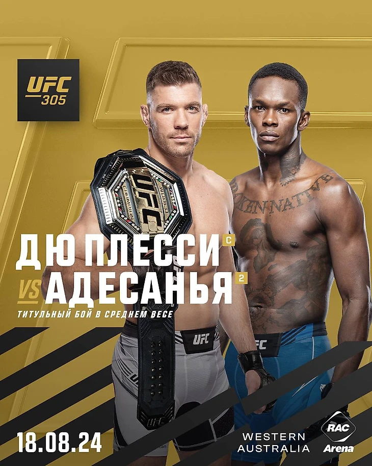 Ночью 18 августа 2024 года будет проведен турнир по смешанным единоборствам UFC 305. Главным событием турнира станет титульный поединок между Дрикусом Дю Плесси и Исраэлем Адесаньей. Бойцы сразятся за титул чемпиона в средней весовой категории. Местом проведения события будет арена «RAC Arena» в Перте, Австралия.