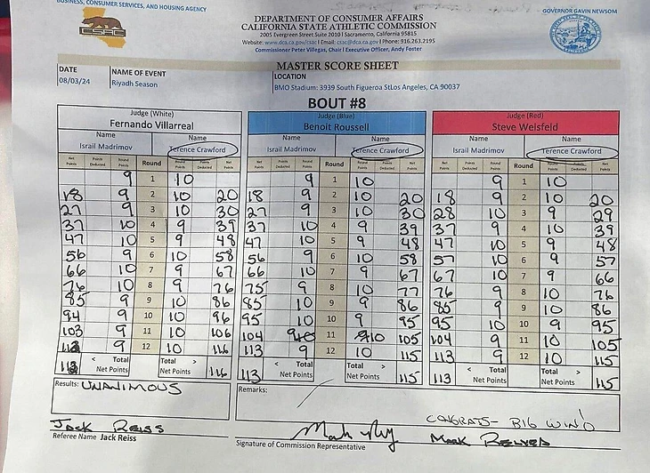 Опубликованы судейские карточки поединка Теренса Кроуфорда и Исраила Мадримова.