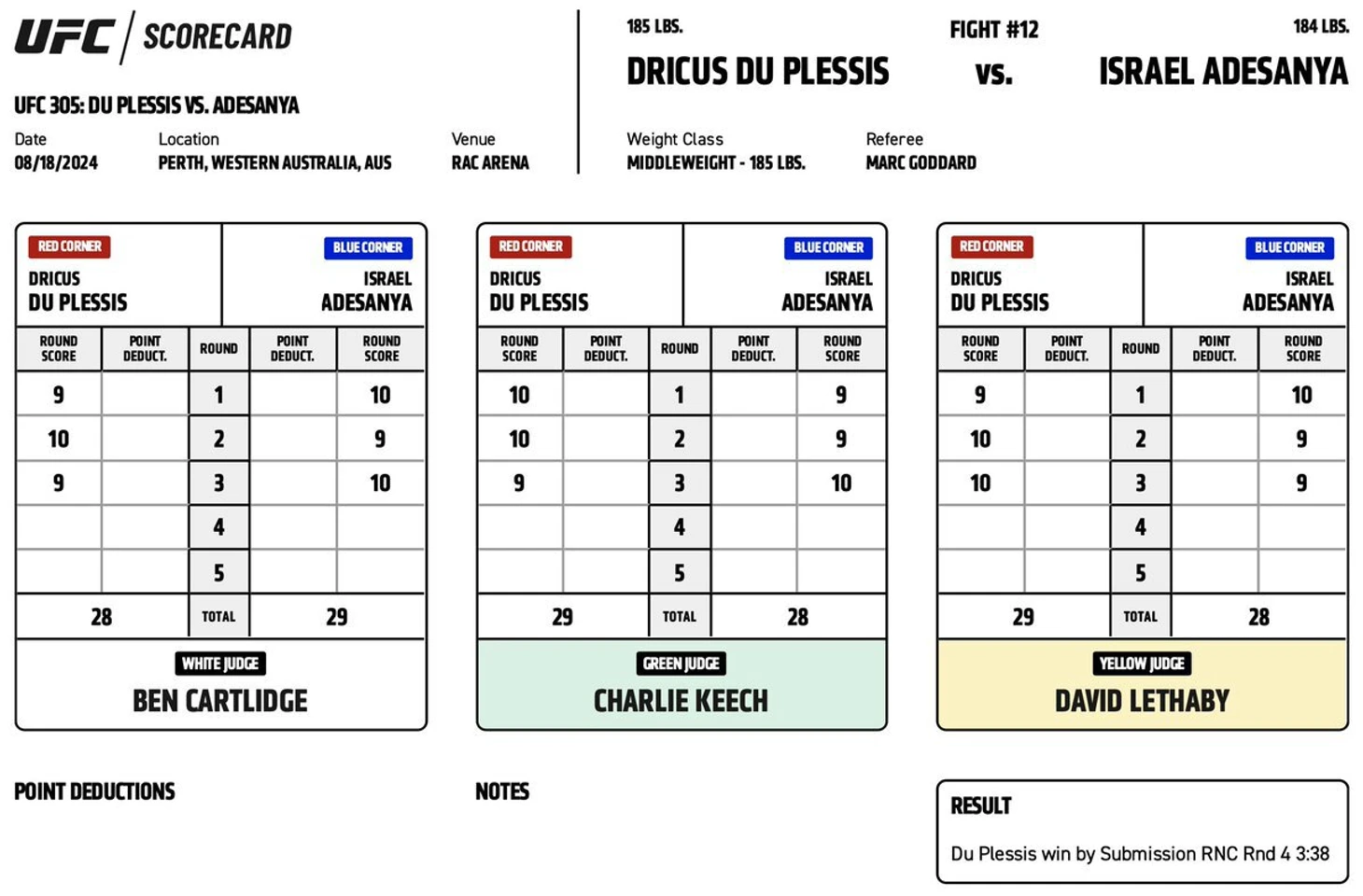 Судейские карточки поединка дю Плесси – Адесанья: Дрикус вел 2-1 после трех раундов