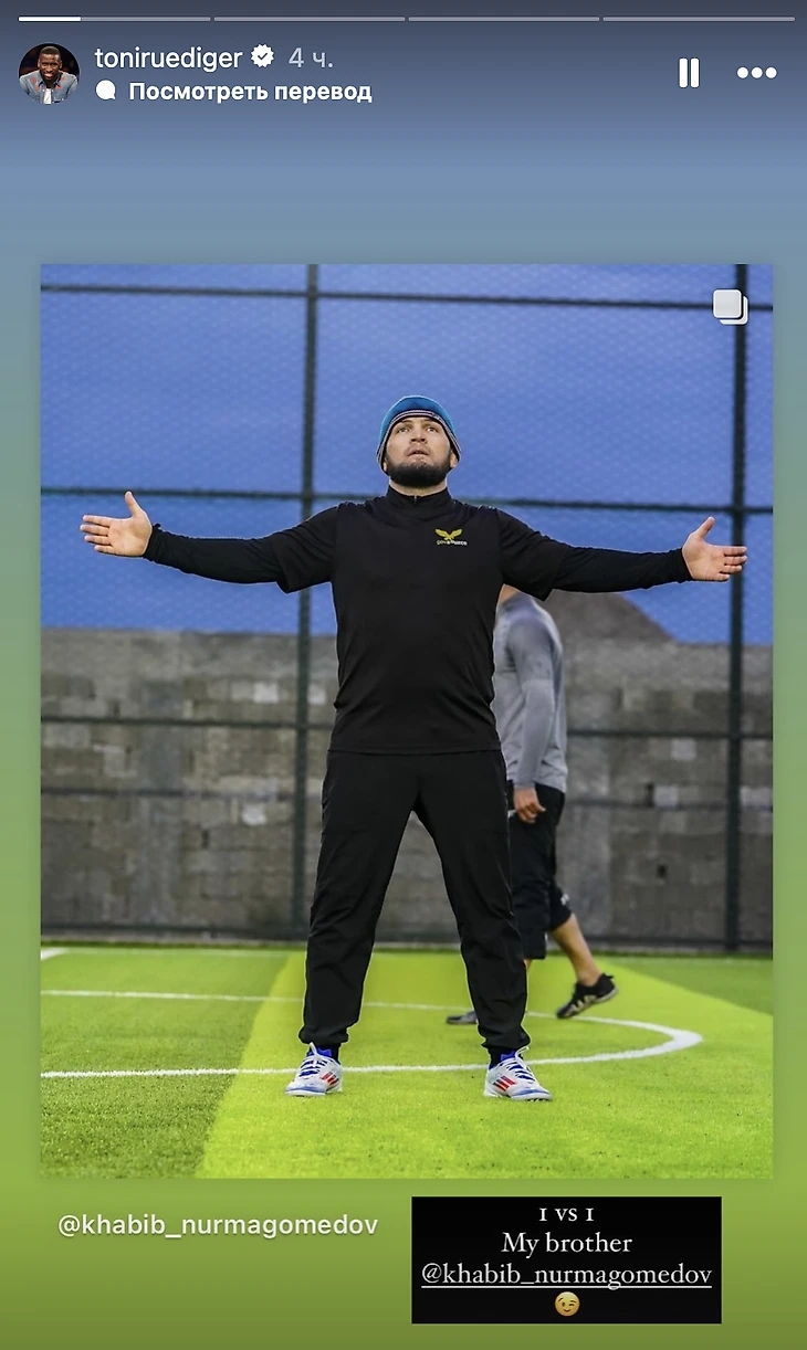 «1 на 1, мой брат», – написал в соцсетях защитник мадридского «Реала» Антонио Рюдигер, комментируя фото Нурмагомедова.