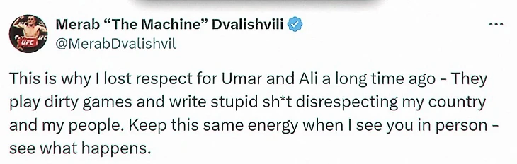 Мераб Двалишвили отреагировал, но затем удалил запись: «Вот почему я давно потерял уважение к Умару и Али Абдель-Азизу. Они играют в грязные игры и пишут глупое дерьмо, не уважая мою страну и мой народ. Сохраняй ту же энергию, когда я увижу тебя лично – посмотрим, что произойдет».