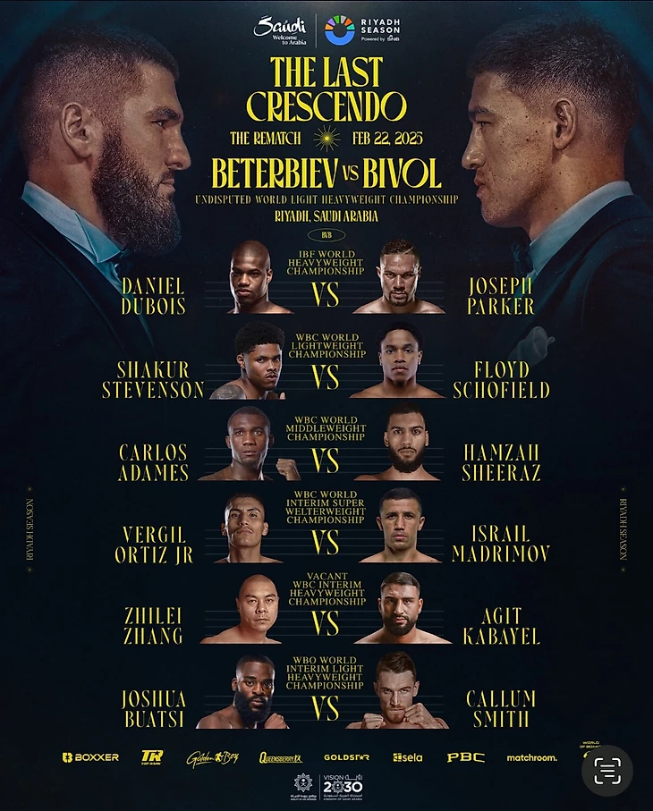 В главном бою состоится матч-реванш за абсолютное чемпионство в полутяжелом весе между Артуром Бетербиевым и Дмитрием Биволом. А в со-главном событии пройдет чемпионский поединок за пояс IBF в тяжелом весе между чемпионом Даниэлем Дюбуа и Джозефом Паркером.