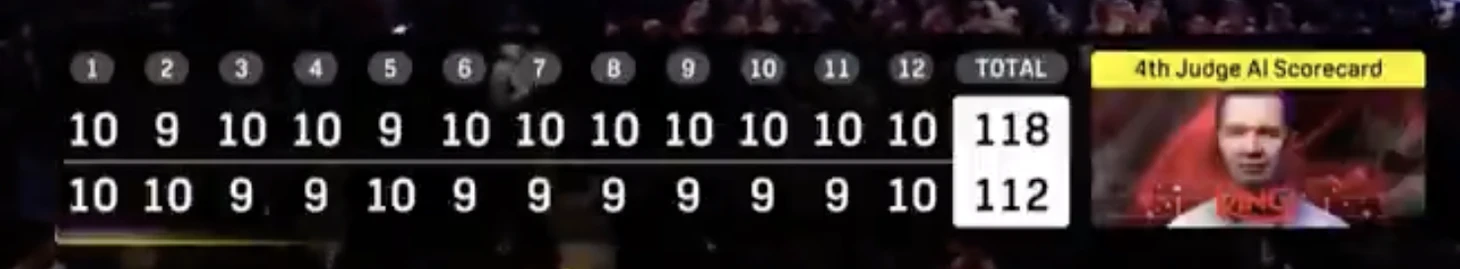 Судьи единогласно назвали его победителем с одинаковым счетом 116-112. ИИ аналогично отдал бой Усику, но с большим преимуществом – 118-112.