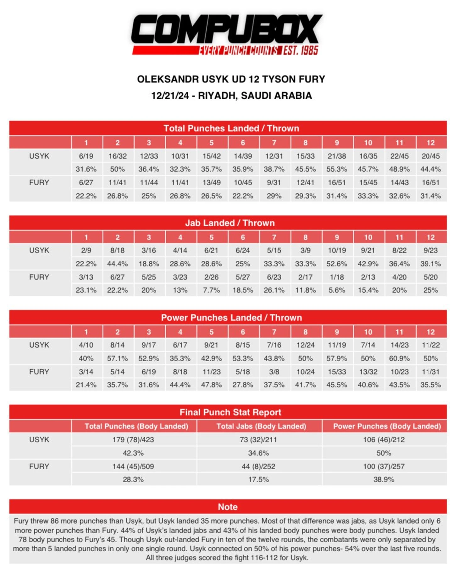 Усик уступил Фьюри по количеству джебов и прямых ударов, но превзошел оппонента в точности.